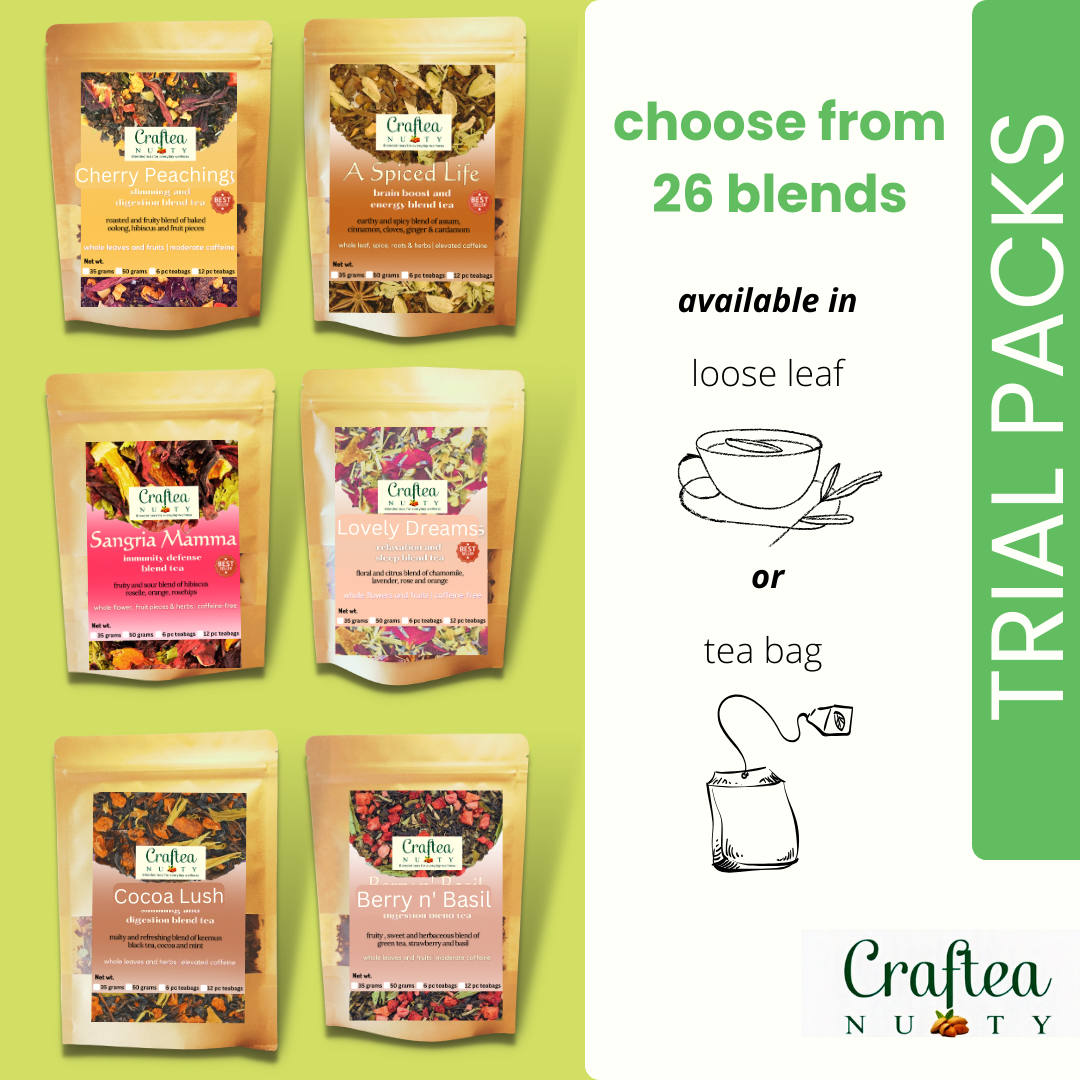 Can't decide which teas to buy. Here are all the best-selling dried blended tea variants in trial pack 30 grams (plus 5 grams more) good for up to 21 servings. Enjoy more tea for the price of 30 grams. Each pouch comes with free disposable teabag. Grab ALL and choose your favorite! Maybe all the blends will be your favorite. PLEASE TAKE NOTE THAT ONLY 15 PACKS can fit in a single pouch. If ordering more than 15 pcs, please generate another order batch (another transaction number). #dried teas #dried flower teas #dried fruit teas #blended teas