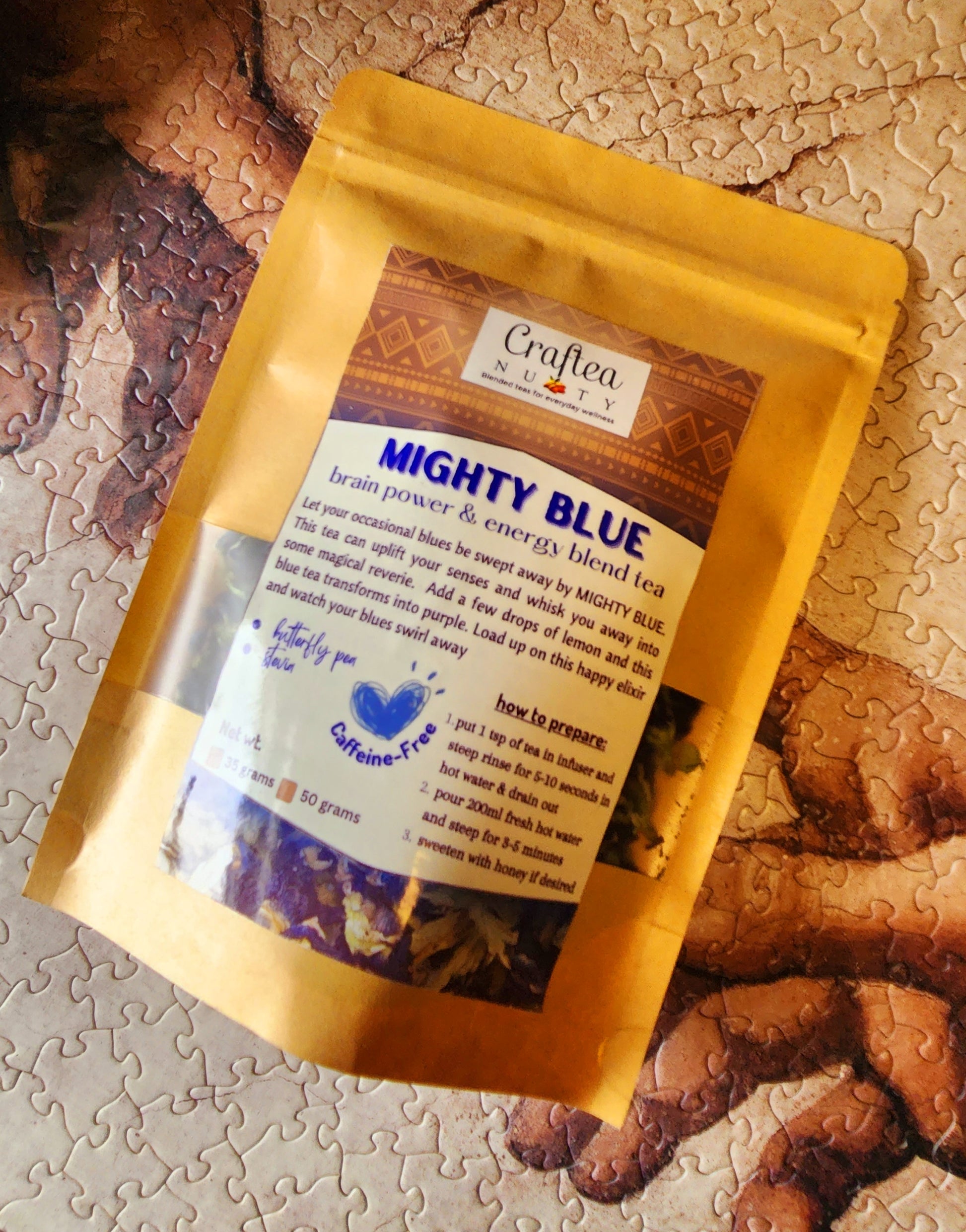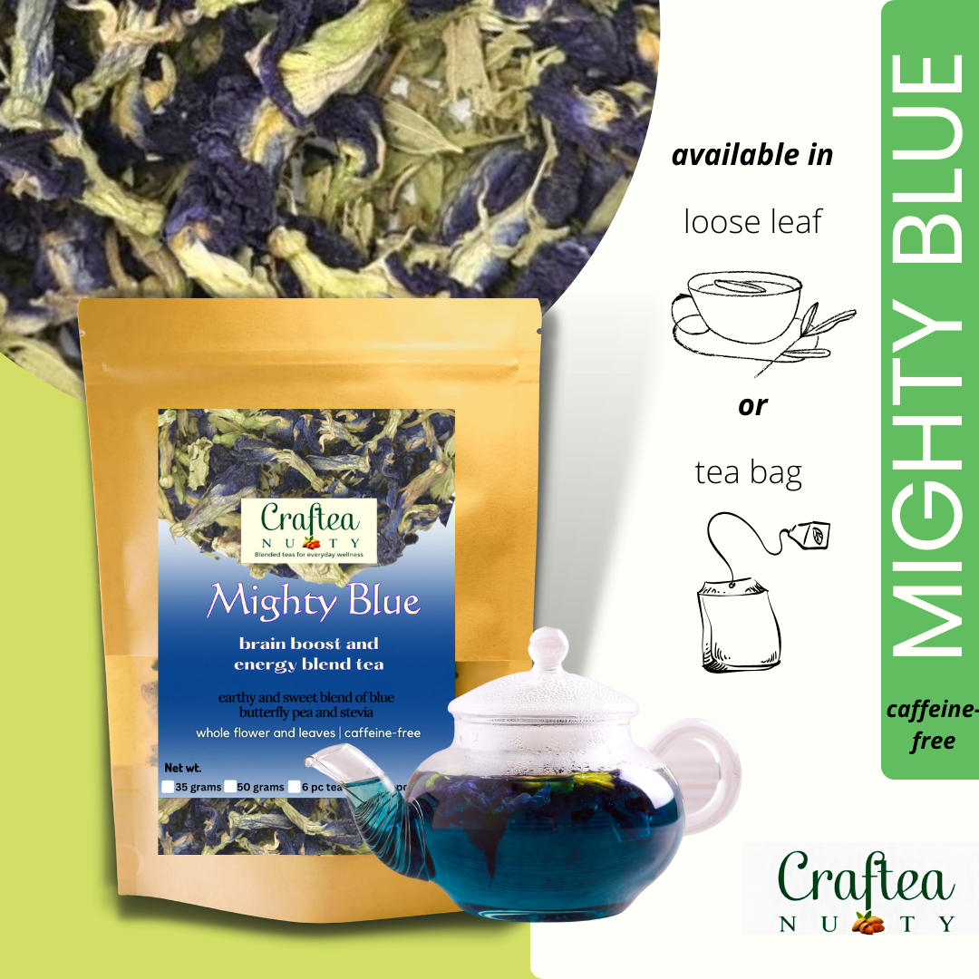 Are you feeling anxious, gloomy or just bored? Let your occasional blues be swept away by MIGHTY BLUE. This tea can uplift your senses and whisk you away into some magical reverie. Add a few drops of lemon and this blue tea transforms into purple. Load up on this happy elixir and watch your blues swirl away.