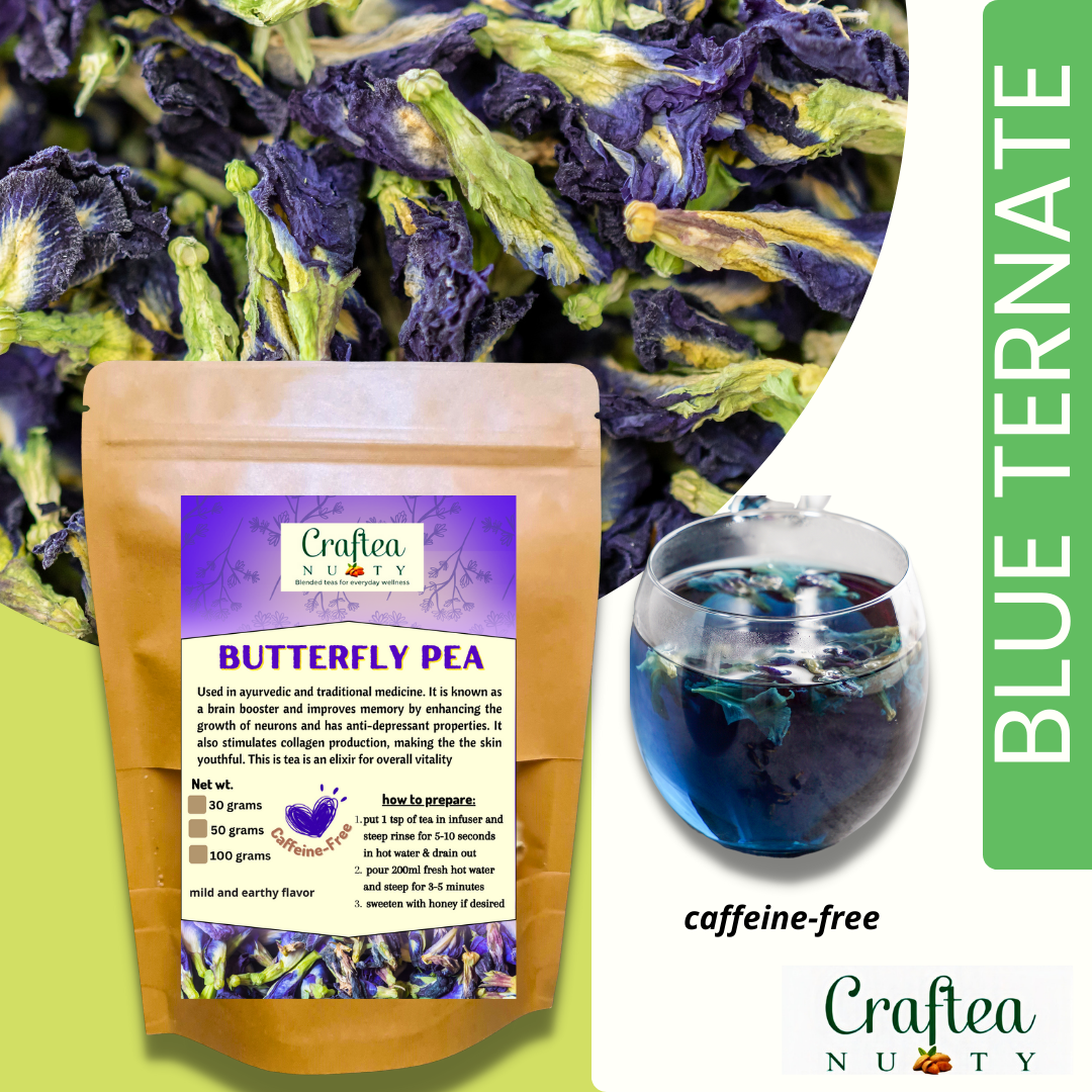 Craftea Nutty Plain butterfly pea tea 30 grams, 50 grams, 100 grams in pouch with free teabags