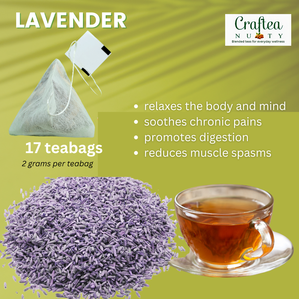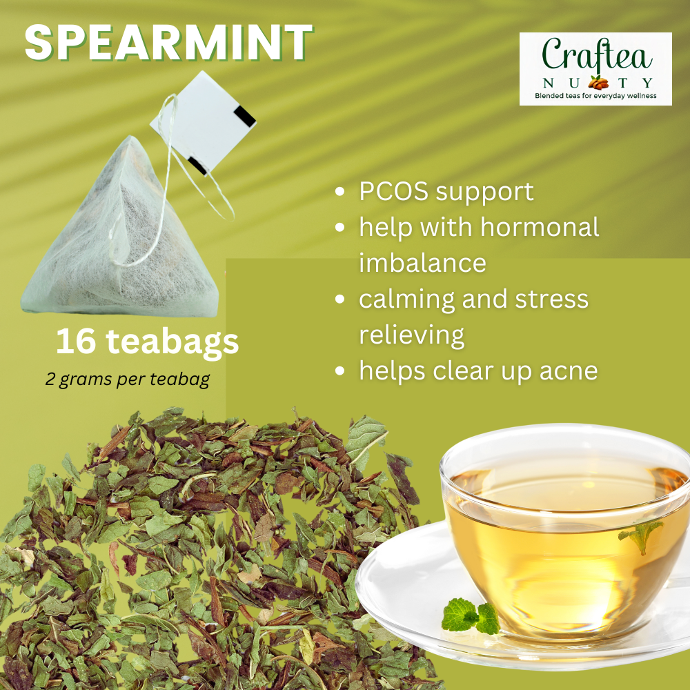 - spearmint - 16 teabags (caffeine-free) perfect for after meals to ease digestion and to manage PCOS or irregular menstruation.lavender - 17 teabags (caffeine-free) perfect to combat stress and anxiety