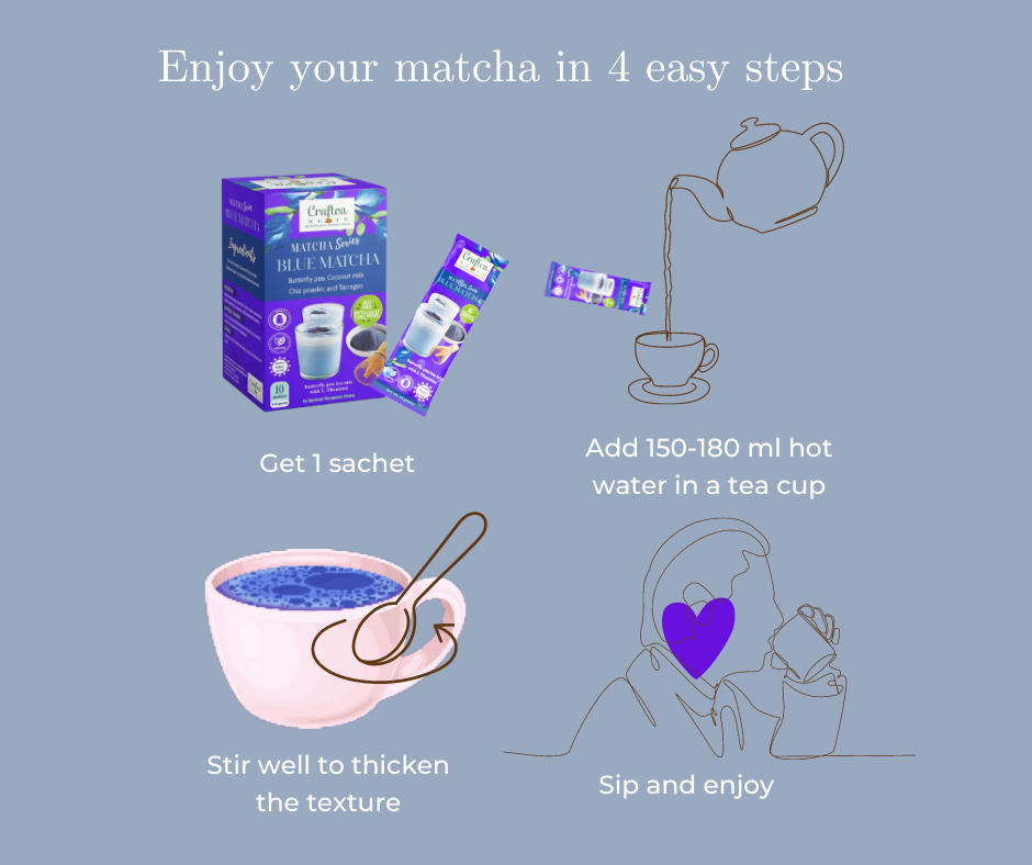 5. Skincare Benefits: Butterfly pea powder is sometimes used in skincare products due to its potential benefits for the skin. The antioxidants in blue matcha help protect the skin from damage caused by free radicals, reducing the signs of aging and promoting a youthful complexion. Make Matcha Series a part of your daily routine and watch as your vibes groove. Embrace the power of matcha and experience the blissful journey it offers.