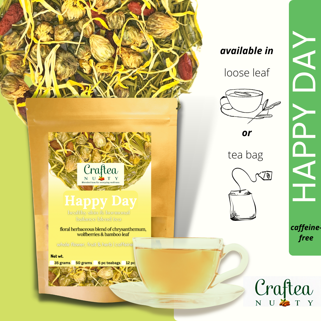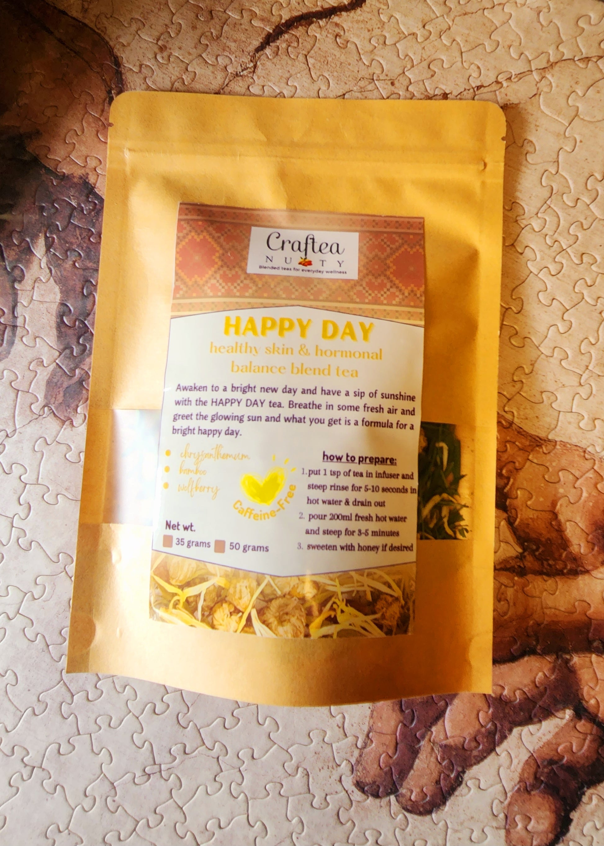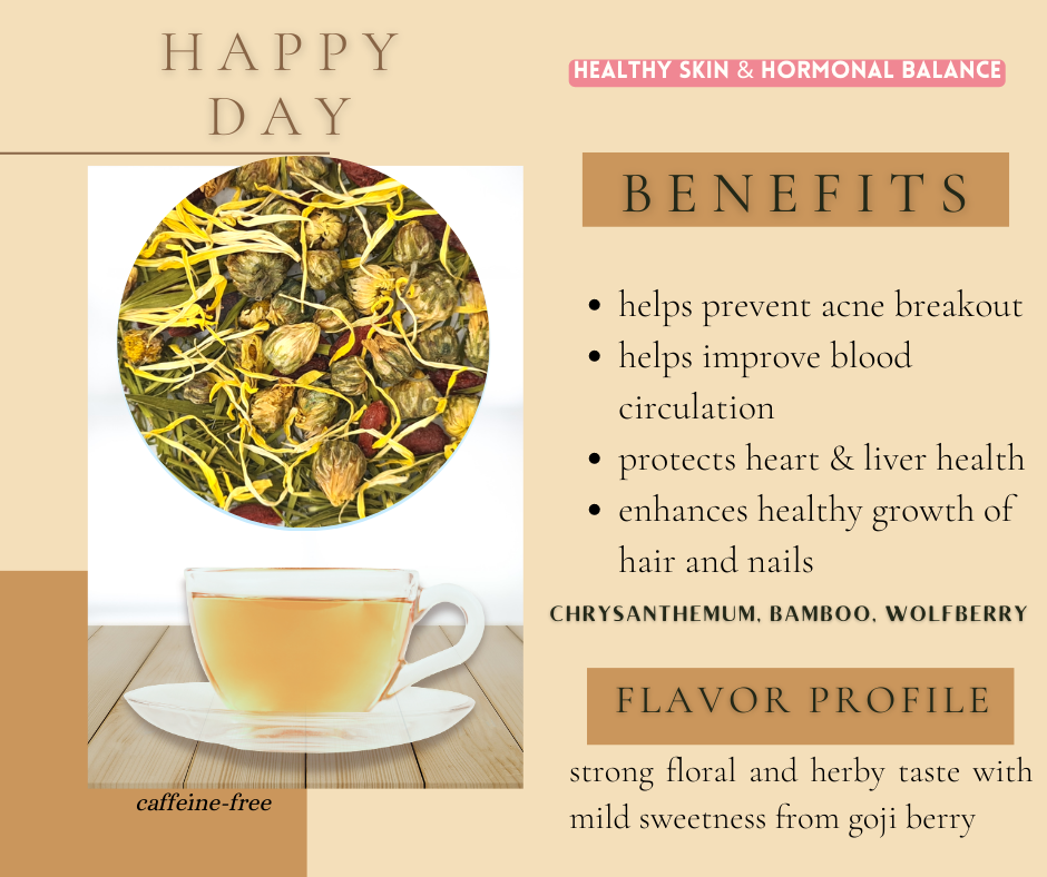 Awaken to a bright new day and have a sip of sunshine with the HAPPY DAY tea. The yellow mums and green bamboo attracts joyfulness, add a touch of red goji for rosiness, breathe in some fresh air and greet the glowing sun and what you get is a formula for a bright happy day.