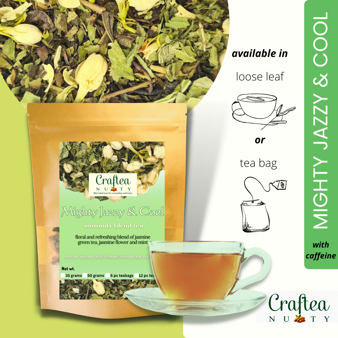 Jasmine is a highly fragrant tea variant which has an excellent antibacterial properties. It reduces joint pains and chronic discomforts. It has a calming effect on nerves. Mint is an equally aromatic herb which is great in easing bloated feeling, clears lung congestion. It also has a calming effect which relieves anxiety.
