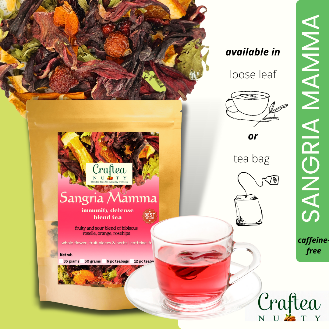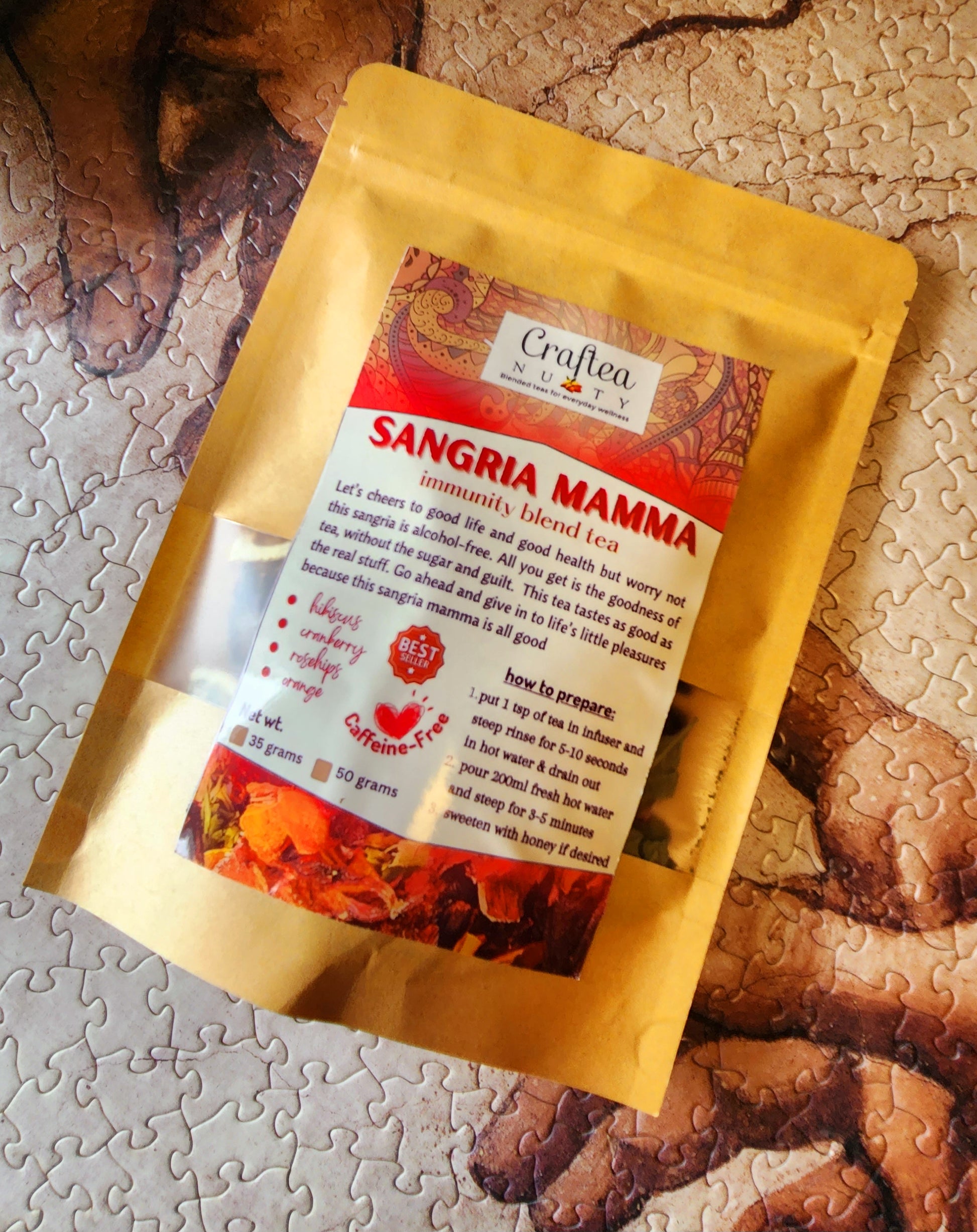 Hola Amigos! Salud a la Buena salud! Let’s cheers to good life and good health but worry not this sangria is alcohol-free. All you get is the goodness of tea, without the sugar and guilt. Who would have thought, this tea could taste as good as the real stuff. Go ahead and give in to life’s little pleasures because this sangria mamma is all good. Roselle is a type of Hibiscus plant that renders a deep red color. This wonderful herb manages hypertension, lowers cholesterol level, and helps restore hormonal balance. It has a cooling effect on the body making it a perfect drink on hot days and it keeps your mood elevated. Hibiscus and Berry tea with cranberry, fruit pieces, rosehip and orange. The taste is reminiscent of sangria but of course without the alcohol. Hibiscus is a naturally tart our sour and can be consumed as hot or cold tea. This blend will blow you away with bursting flavors of sweet, sour and minty berry. The original sangria tea blended by craftea nutty.